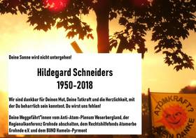 (10.10.18/GS) Unsere Mitstreiterin Hildegard Schneiders durfte nur 68 Jahre alt werden. Wir haben sie erlebt in ihrem großen Engagement für den Naturschutz und gegen die Atomkraft: