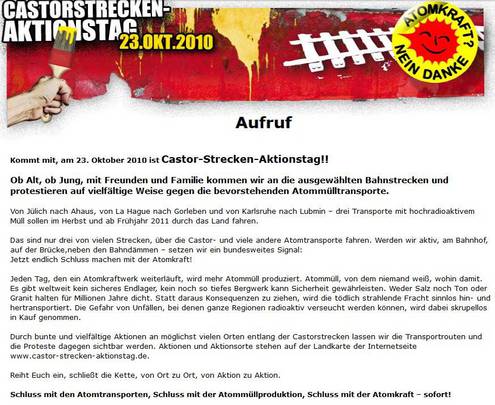 Mehr als 20.000 Menschen an über 120 Aktionsorten im ganzen Land beteiligten sich am 23. Oktober 2010 am Castor-Strecken-Aktionstag. Angeregt von Südwestdeutschen Bürgerinitiativen und organisiert von der Arbeitsgemeinschaft Schacht KONRAD und der BI Lüchow-Dannenberg, sollte der Tag möglichst viele Menschen anregen, die Transportgefahren vor der eigenen Haustür in den Blick zu nehmen, zum Aktionsort und öffentlichen Thema zu machen. Die größte Demonstration fand mit 3.000 Teilnehmern in Hannover statt, es gab Demonstrationen, z.B. in Freiburg (1000) oder bei Biblis (500). In Schaumburg fuhren Menschen nach Auftakrtkundgebungen an den S-Bahn-Bahnhöfen nach Stadthagen, wo sich 250 Menschen zu einer Kundgebung trafen, GRÜNE, SPD und Autonome ihre Position darlegten und zu den Castor-Protesten im November im Wendland aufriefen. Und als die Demonstration losgehen sollte, kam doch tatsächlich ein Castor um die Ecke und mußte blockiert werden. In der Folge entstand der Anti-Atom-Bündnis Schaumburg. In Hameln fand erstmals das Rattenscheuchen statt, das dann einige Monate die Gemüter erhitzte. In Alfeld organisierte die Arbeitsgemeinschaft Schacht KONRAD gemeinsam mit dem GRÜNEN Ortsverband eine Kundgebung. Aktive der BürgerAktionSichereAsse (BASA, Kreis Wolfenbüttel), fuhren in ihren genähten Atommüll-Fässern nach Banteln und trafen sich dort mit rund 50 örtlichen Akteuren. Die meisten Aktionen aber wurde von kleineren Gruppen oder Einzelnen durchgeführt: Infostände, Fahrradtouren (z.B. von Bremen an die Strecke bei Nienburg), Streckenbeghungen oder Bahnfahren mit Atommüll-Fässern. Dazu gab es einen Aktionsleitfaden mit vielen Anregungen. An vielen Orten entschlossen sich Aktive kurzfristig oder sogar noch während des Tages, Aktionen durchzuführen und darum ist die Aktionsübersicht nicht ganz vollständig. Die Informationen von den verschiedenen Orten wurde im KONRAD-Haus in Salzgitter zusammengetragen, unmittelbar getickert und an die Presse weiter gegeben.
