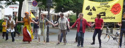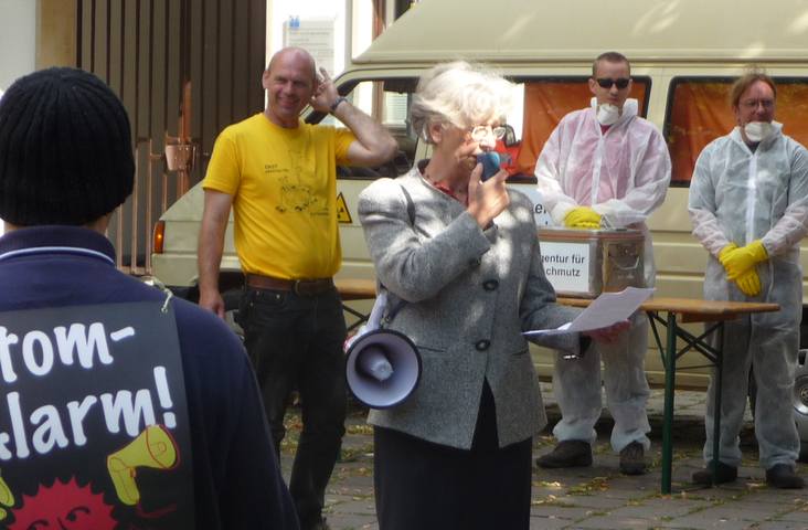 Der Münsterkirchhof, den die Kirche wegen einer Baustelle in der Fußgängerzone dankenswerter Weise zur Verfügung gestellt hatte, ist ein etwas abgelegnes, idyllisch-schattiges Plätzchen, für die Pferde bestimmt angenehmer als die pralle Sonne, aber so bleibt die Veranstaltung doch etwa familiär. Auf dem Platz erwartet uns eine Frau vom Strahlenschmutzamt, die sich darüber beschwert, dass keiner den Atommüll haben will. Aber, sie hätten jetzt ein probates Mittel gefunden, die Nörgler an dem Problem zu beteiligen. Als sie anfangen will, Atommüll in Döschen ans Publikum zu verteilen, (sch)reiten 2 Friedensreiterinnen ein und machen dem Spuk ein Ende. Schön, dass die Anti-AKW-Bewegung jetzt auch Kavellerie hat. Für das Anti-Atom-Plenum Weserbergland gingen Britta Kellermann und Bernd Schlinkmann auf die aktuelle Situation ein. Während Britta Kellermann sich sehr konkret gegen die Verlängerungen der AKW-Laufzeiten wandte und zur Demonstration am 18. September in Berlin aufrief, wurde Bernd Schlinkmann grundsätzlicher, hatte auch noch ein Verbot von Tiefseebohrungen und die Forderung nach einer Kreislaufwirtschaft auf der Agenda. Rainer Sagawe, Klimapolitischer Sprecher des BUND Hameln-Pyrmont und Urgestein des Grohnde-Widerstandes erläuterte die aktuelle Energiepolitische Situation, dass eine vollständige Energieversorgung durch Erneuerbare absehbar möglich ist und wies auf die regionalen Potenziale hin.