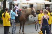 (So., 01-08-2010/Di) Auftakt Friedensritt 2010: Begleitet vom Anti-Atom-Plenum Weserbergland und vielen HamelnerInnen ging es vom Bahnhof durch die Stadt zum Münsterkirchhof. Viel Sympathie vom Straßenrand und aus den Häusern: Winken, Lachen, Daumen hoch, viele Leute machen Fotos von dem nicht alltäglichen Zug.