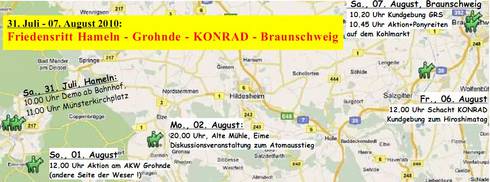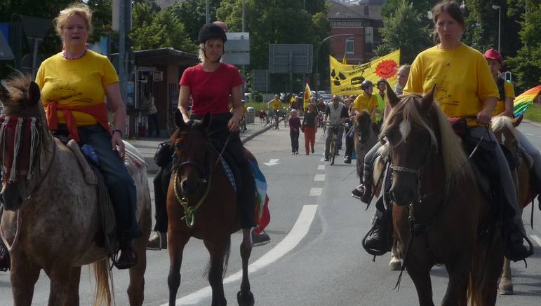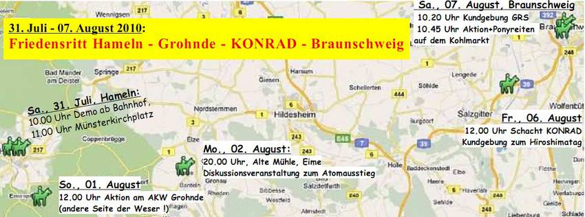 (Fr., 30-07-2010/Di.) Mit einer Auftaktaktion in Hameln beginnt am morgigen Samstag, dem 31. Juli der diesjährige Friedensritt. Motto: Endlich den Hahn zudrehen - Atomausstieg jetzt, bevor es zu spät ist! Die einwöchige Veranstaltung führt die etwa 30 engagierten ReiterInnen von Hameln nach Braunschweig und verbindet den Atommüll-Produzenten Grohnde mit dem geplanten Endlager KONRAD in Salzgitter. Der Tross besteht aus Menschen auf Fahrrädern und Pferden, dazu Begleitfahrzeuge für das Gepäck und einen Küchenwagen, in dem täglich vegetarisch gekocht wird.