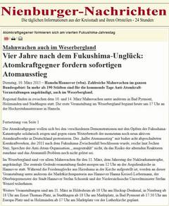 Hameln: Spontanes Gedenken am Tag nach der Katastrophe im Münster, eine erste Mahnwache dann am 21. März mit 300 TeilnehmerInnen und eine zweite mit 200 am 28. März. Das Anti-Atom-Plenum Weserbergland rief mit zur Demonstration am 19. März in Hannover (10.000 TeilnehmerInnen) auf und konzentrierte sich im weiteren auf die für den 25. April geplanten Großaktion am AKW Grohnde und weitere Standortaktionen 2011 und 2012. (siehe auch detailliert: Mahnwachen Hameln)
