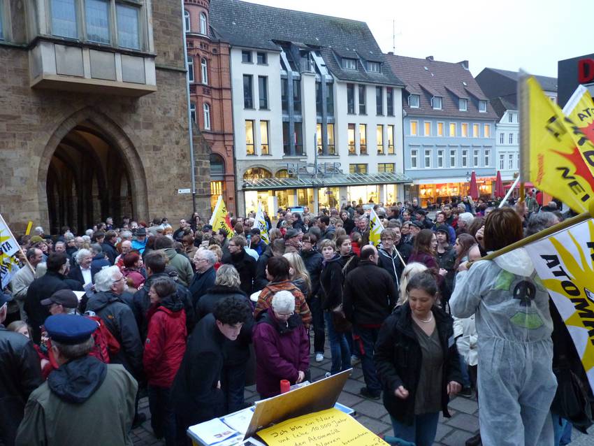 Hannover: Auch in Hannover gab es eine erste Aktion bereits am Tag nach Beginn der Katastrophe. „Einige Dutzend Atomkritiker haben sich am Sonnabend gegen 18.00 Uhr vor dem Hauptbahnhof versammelt und gegen die Folgen der Atompolitik protestiert“ berichtet die Hannoversche Allgemeine [HAZ-Bericht]. Am Montag, dem 14. März versammelten sich dann Hunderte Menschen in der Innenstadt zu einer Mahnwache und Demonstration. Bereits für den nachfolgenden Samstag wurde eine Demonstration vorbereitet, an der sich nach unterschiedlichen Quellen 6.000 - 10.000 Menschen beteiligten und auch im Rahmen der bundesweit 21 Demonstrationen am 28. Mai war Hannover einer der Demo-Orte.
