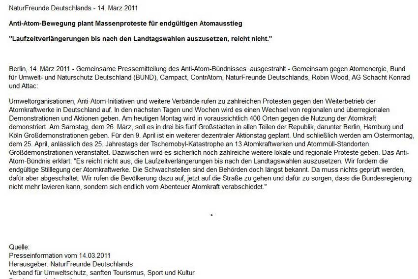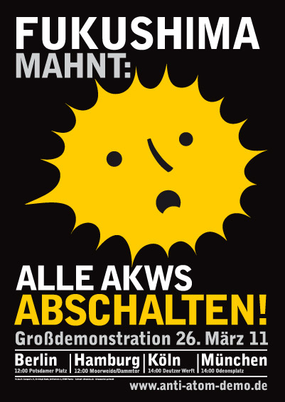 Bereits zu den Mahnwachen am 14. März veröffentliche ein Bündnis bundesweiter Akteure einen Aufruf (siehe rechte Spalte) zu weiteren Protesten und verwies auf die langfristig geplanten Standort-Demonstrationen am Ostermontag (25.4.). Kurzfristig initiierte das Bündnis aber schon für den 26. März eine Demonstrationen in vier bundesdeutschen Großstädten, die mit über 250.000 TeilnehmerInnen zur größten Anti-Atom-Demo in Deutschland ever wurde.