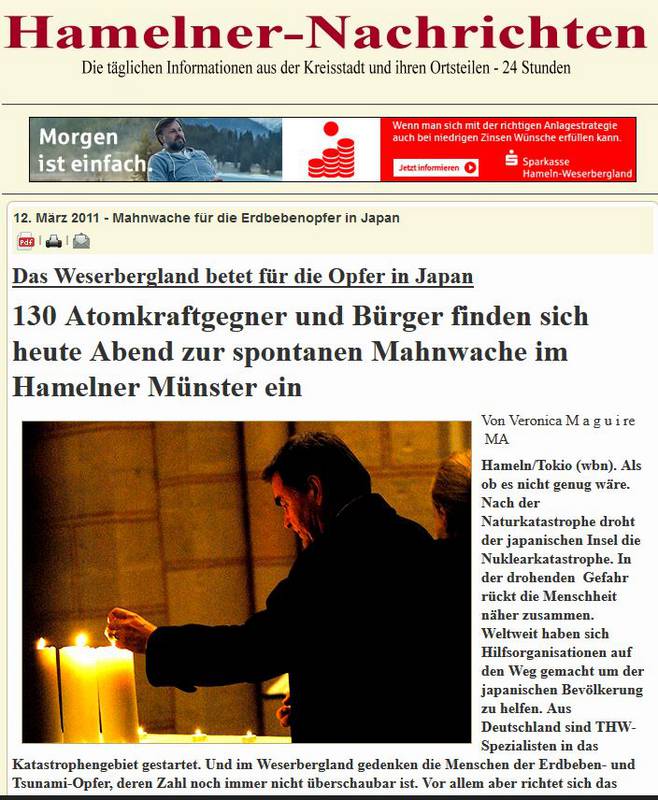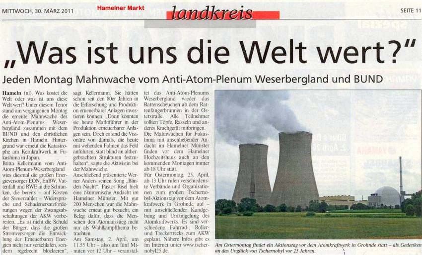 21.03.2011: Das Anti-Atom-Plenum-Weserbergland, der BUND Hameln-Pyrmont und die Münster-Kirchengemeinde St. Bonifatius hatten am Montag erneut zur Mahnwache für Fukushima eingeladen. 300 Menschen gedachten um 18:00 Uhr am Hochzeitshaus den Menschen in Japan, die ihr Zuhause verloren haben … . Britta Kellermann vom Anti-Atom-Plenum-Weserbergland forderte die deutschen Politiker auf, parteiübergreifend nach einem Konsens zu suchen um die Energiewende zu Erneuerbaren Energien einzuleiten und alle Atomkraftwerke endlich abzuschalten. Auch Pastorin Grote und Rainer Sagawe (BUND) wiesen in einer anschließenden Andacht in der Münsterkirche den Weg Richtung Erneuerbare Energien.