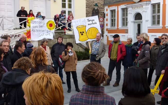 (So., 03-04-2011/Di.) Rund 100 Leute folgten am vergangenen Montag dem spontanen Aufruf von Privatpersonen und versammelten sich um 18.00 Uhr vor dem Rathaus in Königslutter. Die Gastgeberin machte mit wenigen Worten deutlich, wie dringend notwendig die endgültige Stilllegung der Atomkraftwerke ist.