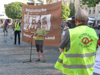 (31.5.2011/ SD) Report einer Braunschweiger Schülerin. Die Mahnwache am 30.5.2011 in Braunschweig wurde mit dem Bericht von der Demo in Hannover am vergangenen Samstag eingeleitet. Begeistert erzählt Simone L., dass viele Menschen da waren und das die aktive Beteiligung weitergehen sollte. Anschließend erzählte Peter Rosenbaum, dass sich Initiativen in den USA gegen hoch radioaktiv verstrahltem Atommüll aus Braunschweig wehren, der in der USA verbrannt und danach wieder nach Deutschland gebracht werden solle. (nuclear watch south ).