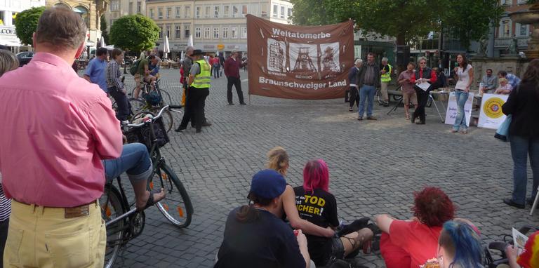 Zur Braunschweiger Fukushima- Mahnwache erschienen etwa 70 BürgerInnen, die bei bestem Wetter und Sonnenschein die Wache hielten. Peter Dickel von der Arbeitsgemeinschaft Schacht KONRAD kündigte nochmals die Demonstration in Hannover am 28.05. an und rief auf nicht nachzulassen, Druck auf die Politik auszuüben. Mitglieder der Gruppe Anti- Atom- Braunschweig wiesen auf die geplanten Aktivitäten in der Region in den nächsten Wochen hin. Zum Abschluss der Kundgebung wurde gemeinsam gesungen.