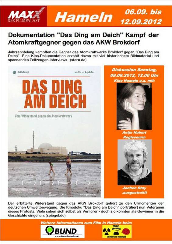 Im Film Das Ding am Deich zeichnet die Filmemacherin Antje Huber Geschichte und persönliche Entwicklung lokaler Akteure der Auseinandersetzung um das AKW-Brokdorf nach. Für Samstag, den 09.09.2012 luden AntiAtomPlenum Weserbergland und BUND Hameln-Pyrmont Antje Huber, Protagonisten des Films aus Brokdorf und VertreterInnen von .ausgestrahlt zu einer Vorführung und Diskussion des Films um 12.00 Uhr in Hameln ein.