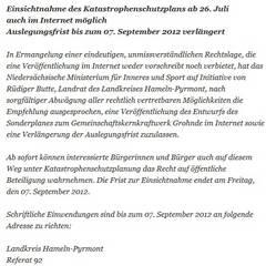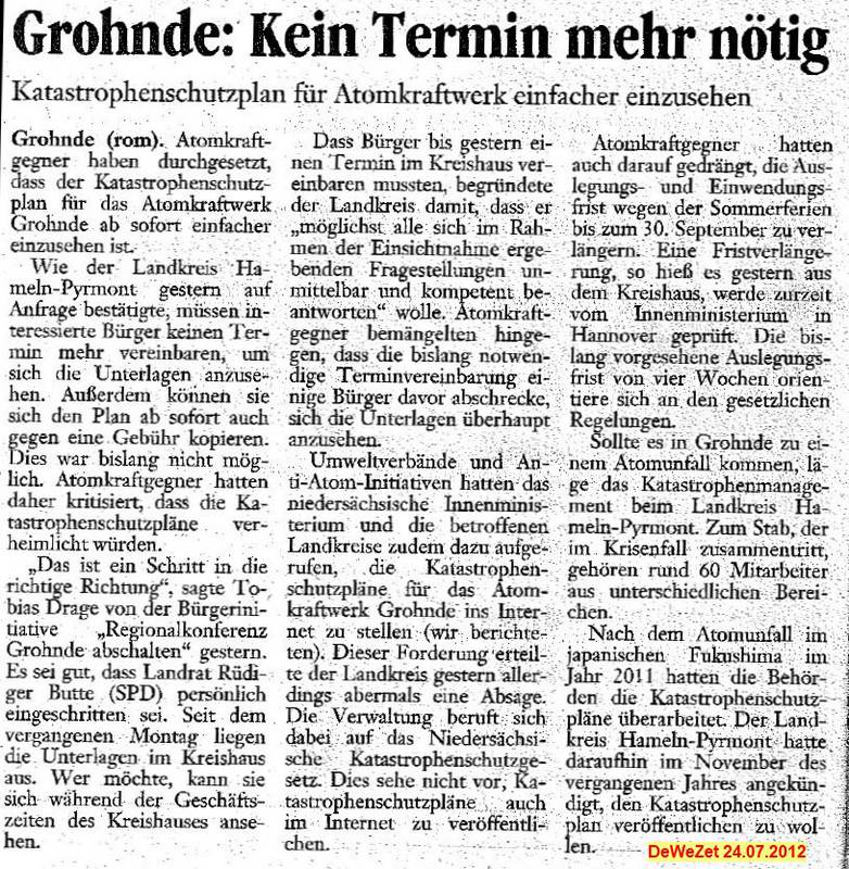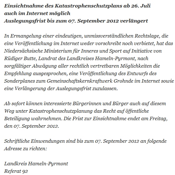 Für die Zeit vom 18. Juli - 17. August wurde die "Offenlegung der externen Notfallpläne" für die Kreise rund um das AKW Grohnde und ab 23.07. dann auch das AKW Lingen angekündigt. Dazu verpflichtet waren die Behörden, weil Änderungen im Niedersächs. Katastrophenschutzgesetz von 2009 in die örtlichen Pläne umgesetzt worden waren. Aktuelle Erkenntnisse aus Fukushima wurden nicht berücksichtigt. [Schreiben des Nieds. Innenministeriums vom 26. Juli 2012]. Bevor eine sachliche Auseinandersetzung möglich war, mußten gegen die Behörden allerdings erstmal elementare Formen der Öffentlichkeit durchgesetzt werden. Die Pläne erwiesen sich dann als hoffnungslos veraltet, widersprüchlich und nicht durchführbar, die Behörden hoffnungslos überfordert, wie die KritikerInnen am 15. August vor der Landespressekonferenz in Hannover berichteten [Geisterzüge im Flickenteppich]. Dass Initiativen und Verbänden verweigert wurde, beobachtend an einer Stabsrahmenübung im November im Kreishaus in Hameln teilzunehmen und die Medien mit Vorführungen bespielt wurden, komplettierte das Bild. In einem Brief an die Innenministerkonferenz im Dezember in Rostock forderten die KritikerInnen realistische Übungen im Umkreis von 170 KM unter einbeziehung der Bevölkerung.