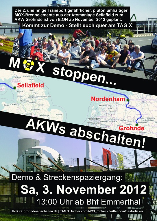 Quelle: henryDT91 Am 12.11.2012 veröffentlicht. Text: Demo gegen den Transport von Plutoniumhaltigen MOX Brennelementen aus der Atomanlage in Sellafield zum AKW Grohnde in Niedersachsen.