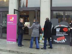 Zur Mobilisierung der Aktions- und Menschenkette am 9. März anlässlich des 2. Fukushima-Jahrestages. Für einen Stand der Grohnde-Kampagne innerhalb der Parteitagsgeländes hatte die beiden Parteien leiden keinen Platz.