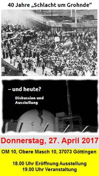 (So. 23-04-2017) Ab Donnerstag wird die Ausstellung 40 Jahre "Schlacht um Grohnde" in Göttingen zu sehen sein, zunächst im OM 10, dann im Kreishaus. Eröffnung am Do., 27. April um 18.00 Uhr im OM10 (ehem. DGB-Haus), Obere Maschstraße 10. Ab 19.00 Uhr geht es mit Filmen, Zeitzeugen und Diskussion um "Geschichte, Gegenwart und Perspektiven der Anti-AKW-Bewegung". [Veranstaltungsflyer Göttingen]