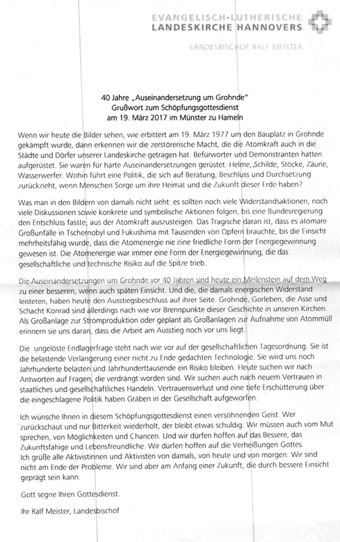 Am Jahrestag selber, am Sonntag, dem 19. März 2017 lud dann das Hamelner Münster zu einem Gottesdienst zur Bewahrung der Schöpfung 40 Jahre nach der „Schlacht von Grohnde“ ein. Vorbereitet von Pastor i.R. Bretzke (bis 1977 Gemeinde Tündern, heute Vorstand im Rechtshilfefonds), Pastor Risel und Team und dem Umweltbeauftragten der Ev.-luth. Landeskirche, Rolf Adler, der auch die Predigt hielt. In einer Grußbotschaft von Landesbischof Meister heißt es u.a.: "Die Auseinandersetzungen um Grohnde vor 40 Jahren sind heute ein Meilenstein auf dem Weg zu einer besseren, wenn auch späten Einsicht. Und die, die damals energischen Widerstand leisteten, haben heute den Ausstiegsbeschluss auf ihrer Seite. Grohnde, Gorleben, die Asse und Schacht Konrad sind allerdings nach wie vor Brennpunkte dieser Geschichte in unseren Kirchen. Als Großanlagen zur Stromerzeugung oder als geplante Großanlagen zur Aufnahme von Atommüll erinnern sie uns daran, dass die Arbeit am Ausstieg noch vor uns liegt."