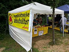 Das zeitweise recht nasse Wetter war nicht unbedingt von Nachteil, weil etliche Besucher bei Regen im Infozelt Schutz suchten. So kam es zu manchen intensiven Gesprächskontakten, bei denen auch Infomaterial zur Klage und zu anderen atomkritischen Themen unters Volk gebracht wurde. Dabei konnte vielfach an die Anfang Juni erfolgte Verabschiedung der Grohnde-Resolution durch den Salzufler Rat angeknüpft werden.