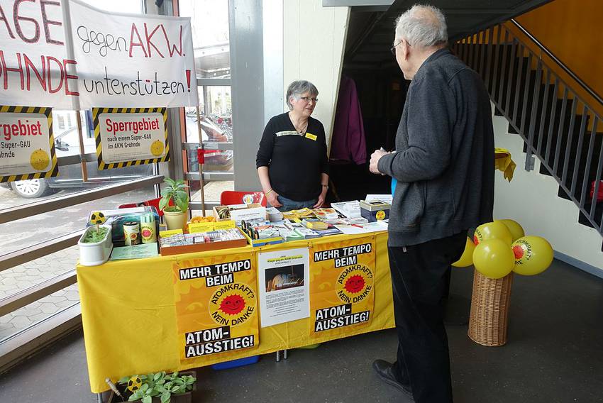 Parallel zum Bühnengeschehen waren im Foyer der Sumpfblume Informationsstände aufgebaut. Vertreten waren das Anti-Atom-Plenum Weserbergland, die AG Schacht Konrad und der Rechtshilfefonds Atomerbe Grohnde e.V.