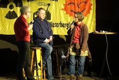 Zum Schluss wurde in einer Frage-Antwort-Runde auf der Bühne über die aktuelle Grohnde-Klage informiert, die seit Oktober 2015 beim OVG Lüneburg liegt, aber aktuell immer noch nicht terminiert ist. Es moderierte Peter Dickel. Sowohl die Kläger (Hans-Peter Leiding aus Grohnde und Mechtild Steinhauer von der Kommune Buchhagen) als auch Vertreter des Rechtshilfe-Vorstands (Karsten Schmeißner) kamen dabei zu Wort und konnten ihre Motivation für die Klage und deren Unterstützung deutlich machen.