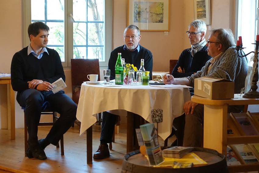 Die Veranstalter hatten die Form einer Interviewrunde gewählt: Hans-Peter Leiding (Grohnde) als Kläger und Karsten Schmeißner (Detmold) vom Rechtshilfefonds Atomerbe Grohnde e.V. standen der Moderatorin Claudia Staubach Rede und Antwort.