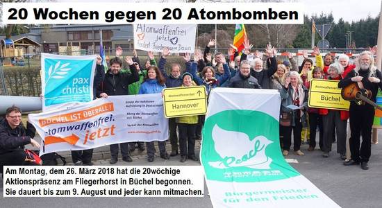 Am Fliegerhorst Büchel in Rheinland-Pfalz hat am Montag eine 20wöchige Aktionspräsenz gegen dort lagernde 20 US- Atomraketen begonnen. „Bis zum Nagasakigedenktag am 9. August werden Friedensaktivist*innen dort vor Ort sein und protestieren. Wofür? Damit die in Büchel stationierten Atomwaffen endlich abgezogen werden und die Bundesregierung dem UN-Atomwaffenverbot beitritt.“, heißt es auf Facebook. Los ging es am Montag mit einer Mahnwache und Kundgebung. Mit dabei auch Hannovers Bürgermeister Thomas Hermann (SPD) als Repräsentant der internationalen „Mayors for peace“. Hannover ist Partnerstadt von Hiroshima, eine der Vizepräsident- und Exekutivstädte des Bündnisses und Lead City für Deutschland, mit bisher 550 Mitglieder. [Mitgliederliste Mayors for Peace Deutschland]