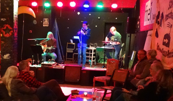 (Di. 16-01-2018/DK) Knapp 40 Mitstreiter/innen auf der 3. Anti-Atom-Party im freiRAUM Walkemühle genossen ein tolles Mitbring-Buffet und ein wunderbar aufgelegtes Musik-Ensemble mit Bob Dulas, Toto Jürgens und dem Flötenspieler "Fludo" Oppermann, das in 3 Blöcken und mit Extra-Zugaben das Publikum grandios unterhielt. Davor und zwischendrin tauschte man/frau sich aus mit Gleichgesinnten im Durchschnitts-Alter 55+ (einige Zeitzeugen der "Schlacht um Grohnde" von 1977 waren damals im Kindes- oder Jugendalter) über zurückliegende oder geplante Anti-Atom-Aktionen.