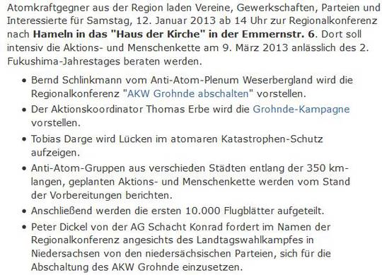 Sicherheitsdiskussion Grohnde: Nachdem e.on wie berichtet bereits im Herbst das Angebot abgelehnt hatte, sich einer öffentlichen Diskussion im Februar zu stellen, soll es im Februar zunächst ein internes Fachgespräch mit Experten geben, um die Agenda der weiteren Diskussion abzustecken. Orientierungspunkte sind dabei gleichermaßen die Landtagswahl 2013, die Bundestagswahl 2014 und Betriebsabläufe. Vor der für 6. - 20. April angekündigten Revision des Reaktors, will die Grohnde-Konferenz gemeinsam mit der Ärzte-Organisation IPPNW Ende März vor Ort über die Strahlenbelastung während der Revision informieren. Medien-Recherchen beim Reaktor Gundremmingen haben nämlich gezeigt, dass die Strahlenbelastung während der Revision deutlich zunimmt. Da die Betreiber nur einen Durchschnittswert für das Jahr angeben, wird diese besondere Belastung nivelliert.