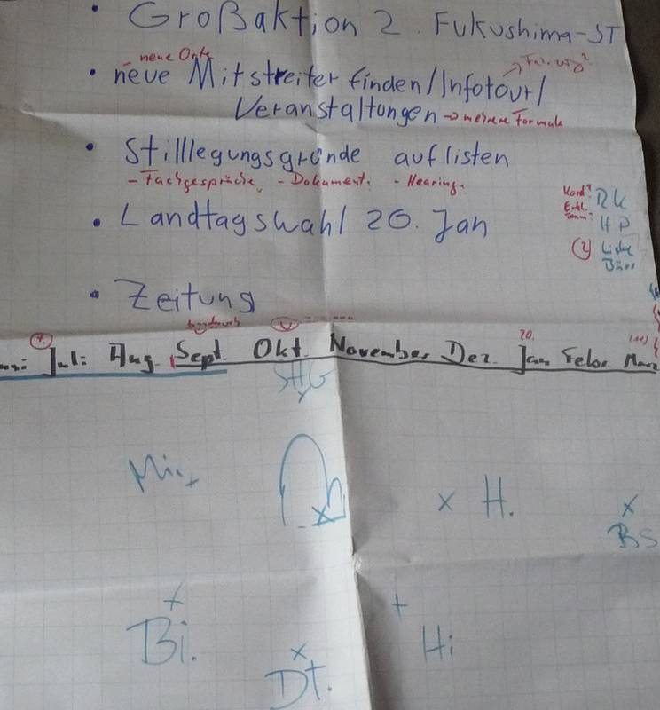 (15.05.12/Stadthagen) Die Idee, zum Fukushima Jahrestag ein großräumiges Katastrophen-Szenario durchzuführen, war bereits bei der Regionalkonferenz am 05. November 2011 in Salzgitter aufgekommen. Aber die Ideen waren noch sehr unkonkret, verschiedene Aktionskonzepte wurden kontrovers diskutiert und vor allem war man sich einig: Bis zum März 2012 ist das nicht alles zu realisieren. Darum traf sich am 15. Mai 2012 eine Arbeitsgruppe, um ein Aktionskonzept für den 2. Fukushima Jahrestag im März 2013 zu entwickeln. Mit diesem Flipchart-Bild fing alles an . . .