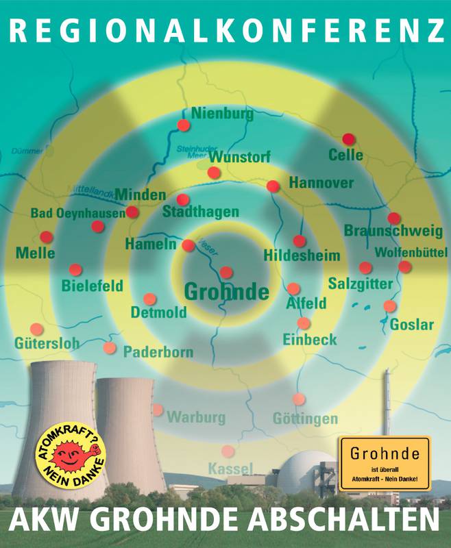 Unter dem Motto „ Fukushima mahnt! – AKW Grohnde stilllegen!“ wird die Regionalkonferenz am Samstag, den 14.3. im Kulturzentrum Faust in Hannover anlässlich des vierten Fukushima-Jahrestages einen Informations- und Veranstaltungstag präsentieren. Dabei sollen tagsüber von 11 bis 18 Uhr in Vortrags- und Diskussionsveranstaltungen die Themen „Aktuelle Lage in Fukushima“, „Bestandsaufnahme Atommüll“ und „Klage gegen das AKW Grohnde“ vorgestellt werden. Gleichzeitig soll den Besuchern in einem separaten Infobereich die Möglichkeit geboten werden, sich mit themenbezogenen Materialien zu beschäftigen, wobei auch Kinder und Jugendliche mit einbezogen werden sollen. Um 13 Uhr ist eine kurze Fukushima-/Grohnde-Kundgebung am Küchengarten vorgesehen.