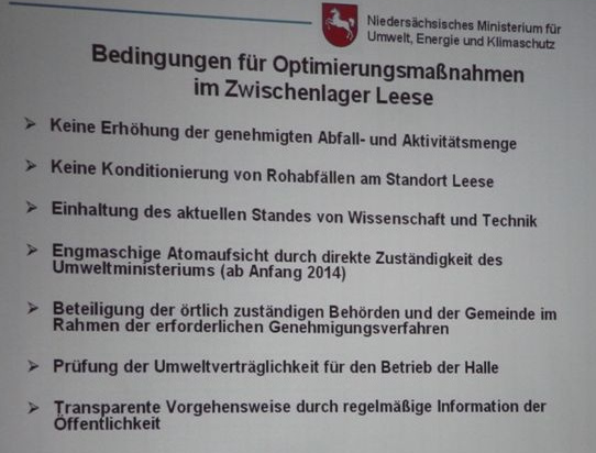 Seit 1 ½ Jahren hatte das Anti-Atom-Bündnis Nienburg versucht, mit dem bisher zuständigen Gewerbeaufsichtsamt und dem Umweltministeriums über das Lager in Leese ins Gespräch zu kommen. Das Gewerbeaufsichtsamt hatte sich einer öffentlichen Diskussion entzogen und auch das Umweltministerium war dazu nicht bereit. Stattdessen lud es zunächst KommunalpolitikerInnen nach Hannover ein und führte jetzt die Bürgerversammlung durch. Ein grundsätzlich anderer Stil als bei früheren Regierungen, mehr Transparenz oder Offenheit für kontroverse Bewertungen ist auch beim grünen Umweltminister Wenzel nicht zu finden. Was am Montag vorgetragen wurde reicht jedenfalls bei weitem nicht aus, um die Risiken des Zwischenlagers in Leese und die Sinnhaftigkeit des geplanten Neubaus zu bewerten.